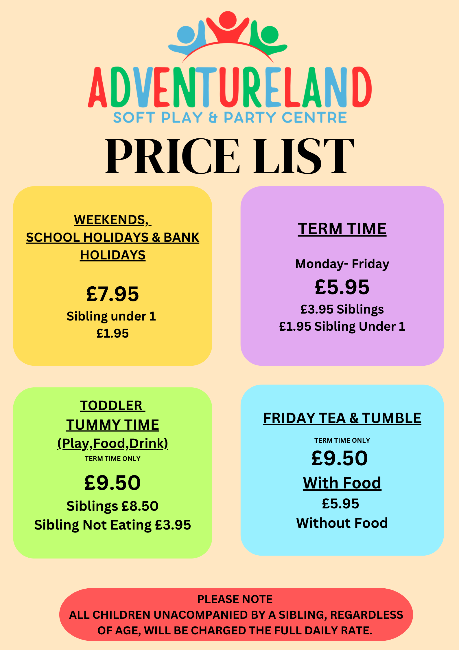 Admission to the Children’s Play Centre includes 1½ hrs play for children aged 6 months-14 yrs inclusive. (Not strictly enforced during quiet times).